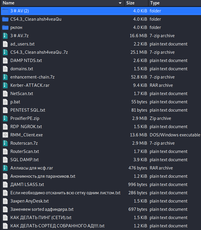 The leaked archive was titled, Мануали для работяг и софт.rar (roughly translated to Manuals for hard workers and software.rar) and contains 51 files in total. The archive included instructions to use a range of applications to aid in their attacks such as net scanners, proxifiers,RDP software, configuring and using Cobalt Strike, how to perform privilege escalation, how to dump credentials, how to perform brute-forcing, using ZeroLogon or Kerberoasting, deleting shadow copies, performing data exfiltration, and more.