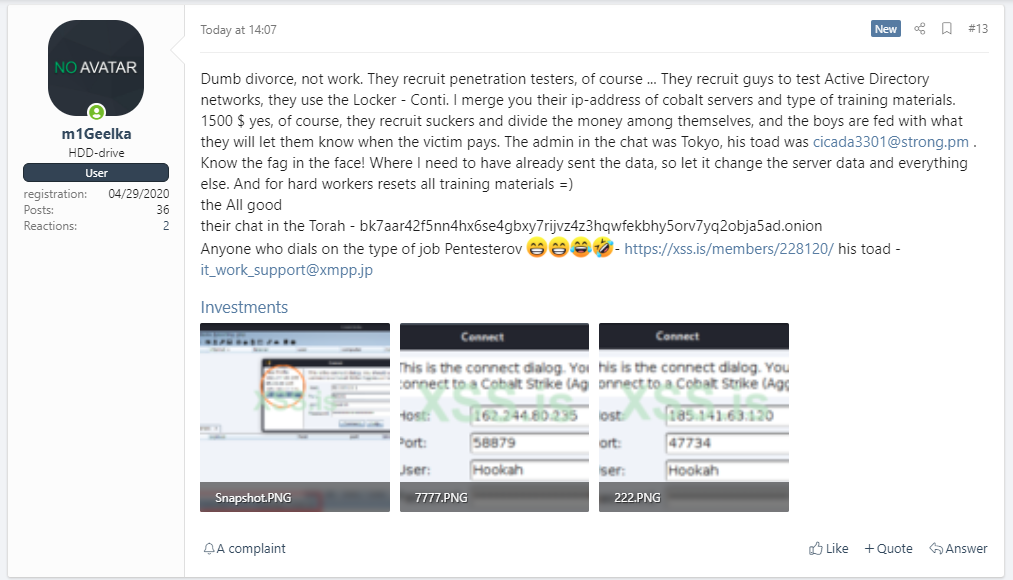 On 5 August 2021, a forum user identified as m1Geelka, leaked an archive of the Conti gang's manual and technical guides in the hacking forum XSS.is. It seemed that the user was an affiliate to Conti Gang and leaked the files due to a salary dispute.