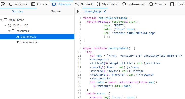 What happened was bountylog.js inserts the value from the fields to the XML template, encodes the data with base64 using btoa() function, and sends a POST request to tracker_diRbPr00f314.php.