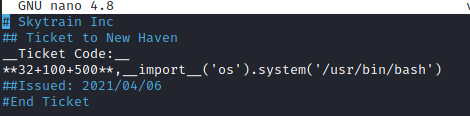 In the /opt/skytrain_inc directory was another folder called invalid_tickets, it contained sample ticket files which were deem invalid. I looked at the code for ticketValidator.py and understood why.