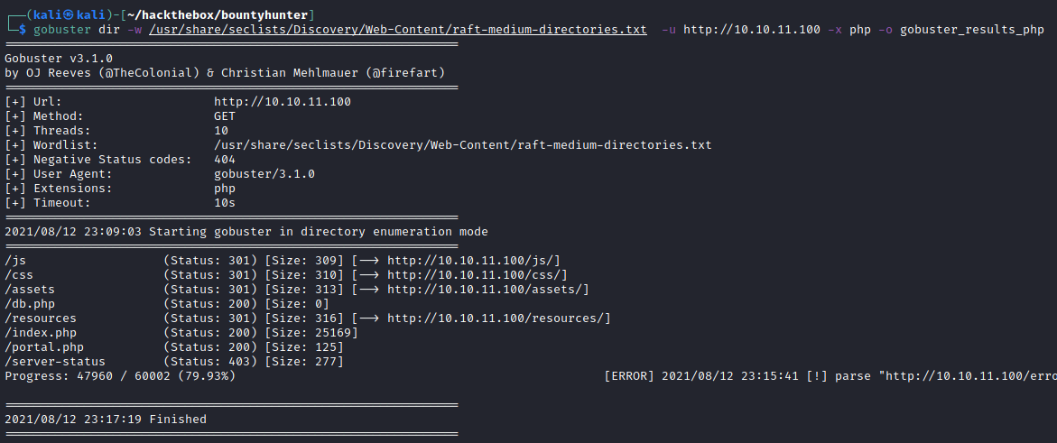 gobuster dir -w /usr/share/seclists/Discovery/Web-Content/raft-medium-directories.txt -u http://10.10.11.100 -o gobuster_results