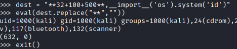 The python eval() function is commonly exploited as it could cause unintended code execution. Theoratically speaking, if I could manipulate the input to lead me to code execution, I would be able to execute code within the script.